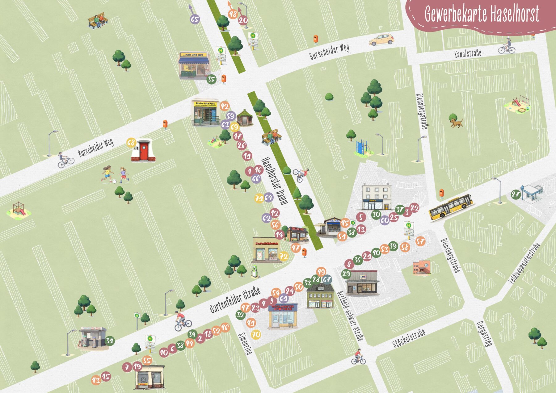 Im Zentrum von Hasel­horst sind über 70 Gewerbetreibende ansässig – eine Zahl, die viele überrascht. Damit sichtbar wird, wer alles ein Geschäft im Zentrum betreibt, hat das GSM eine Gewerbekarte erstellt. Diese bietet sowohl Kund:innen als auch den Gewerbetreibenden einen Überblick und liefert nützliche Informationen wie Adressen und Kontaktdaten der einzelnen Betriebe.